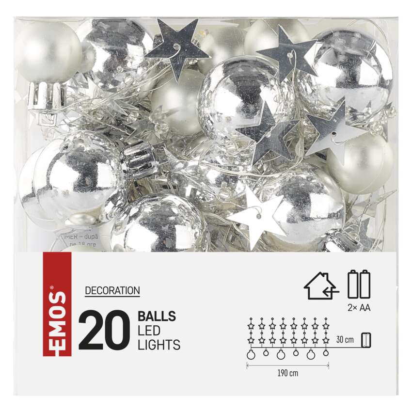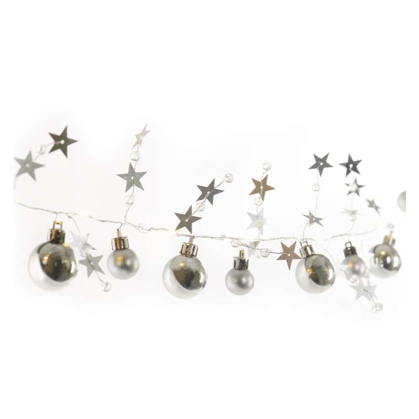 LED vianočná girlanda – strieborné guličky, 1,9 m, 2x AA, vnútorný, teplá biela, časovač