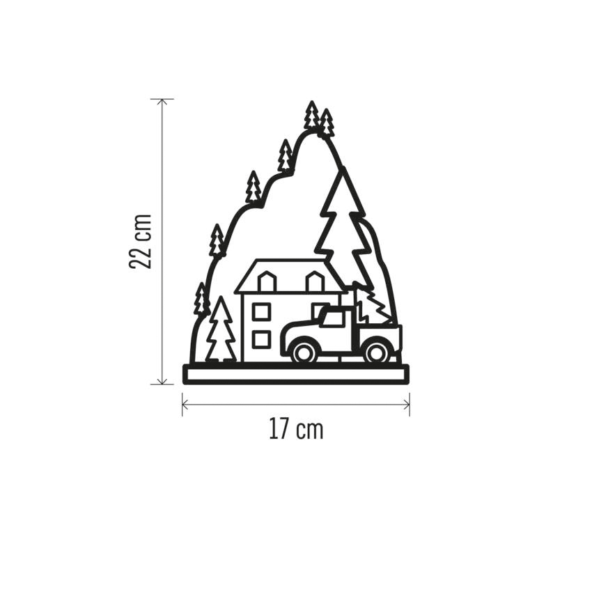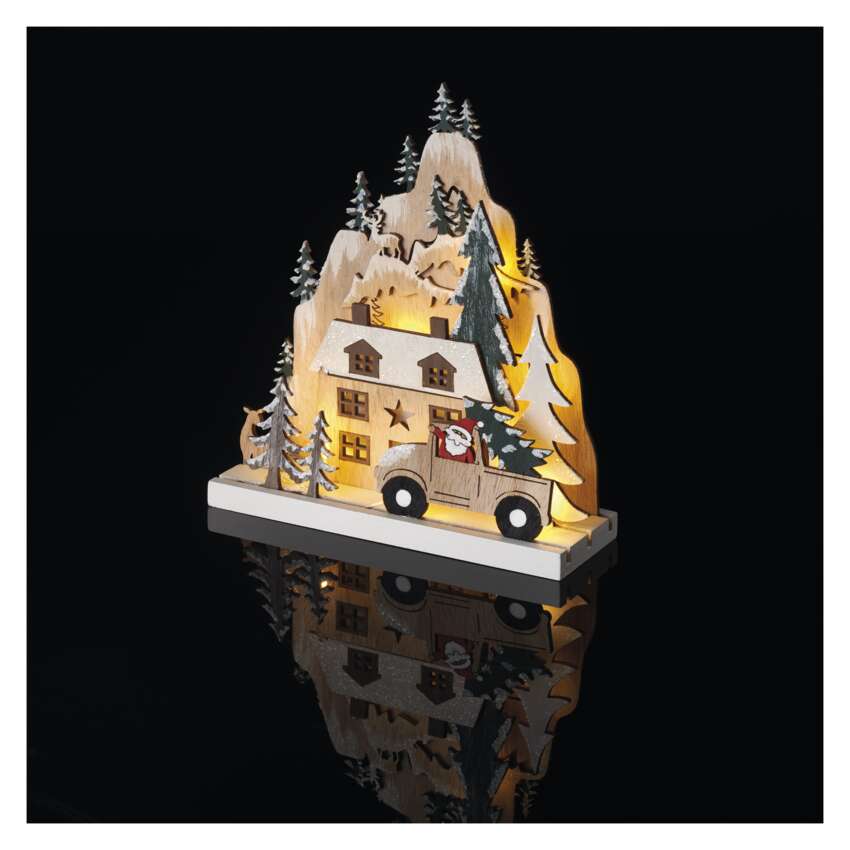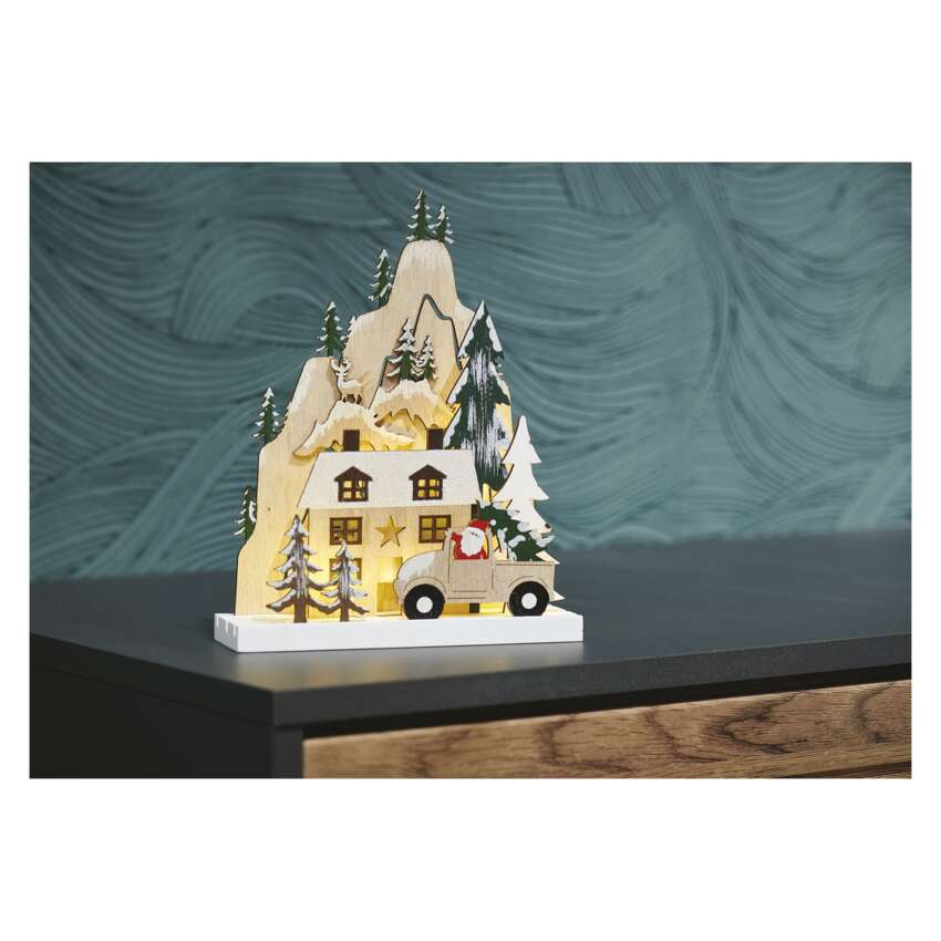 Drevené dekorácie navodzujú atmosféru tradičných Vianoc, ktorú charakterizuje vôňa perníkov, zvuk vianočných kolied a nezameniteľná chuť zemiakového šalátu. Drevená dekorácia "Vianočná krajina" je vybavená príjemným teplým bielym osvetlením. Vďaka napájaniu pomocou batérií AAA ho môžete umiestniť na ľubovoľné miesto vo vašom interiéri a bude vyzerať skvele najmä na okennom parapete, komode alebo TV stolíku.