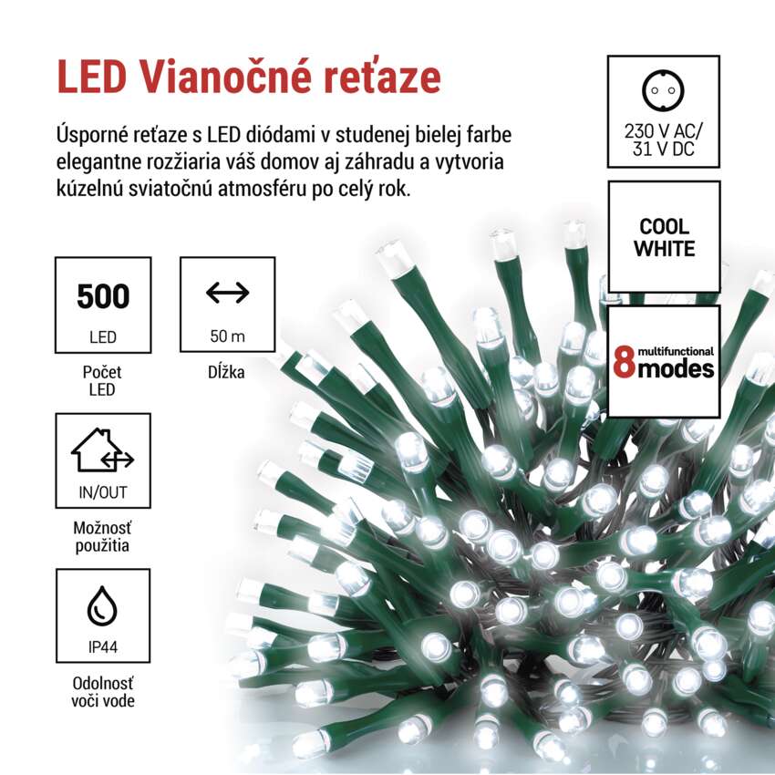 LED vianočná reťaz, 50 m, vonkajšia aj vnútorná, studená biela, programy, časovač