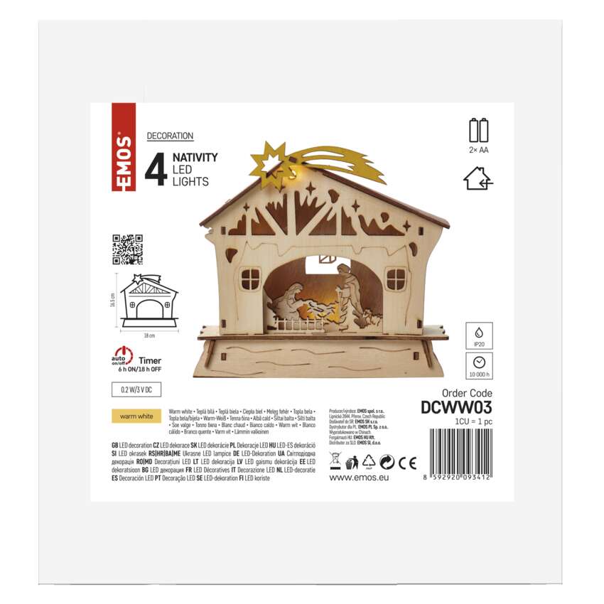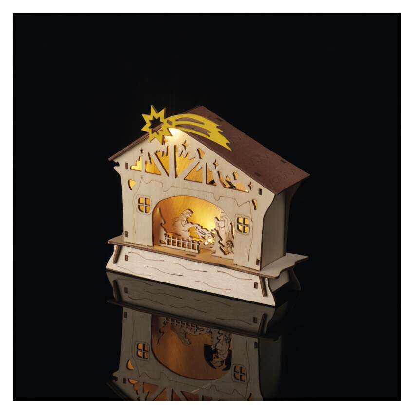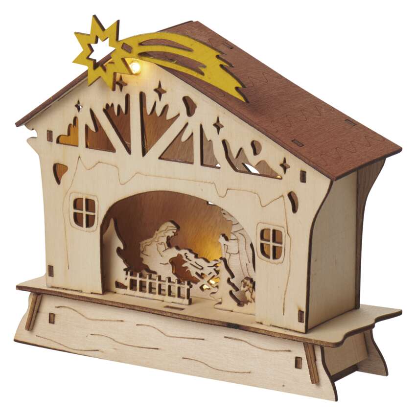 LED vianočný betlehem drevený, 16,5 cm, 2x AAA, vnútorný, teplá biela, časovač
