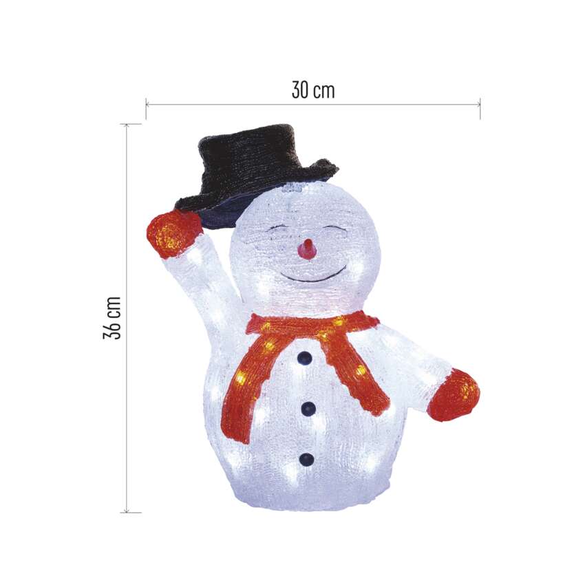 LED vianočný snehuliak s klobúkom, 36 cm, vonkajší aj vnútorný, studená biela, časovač