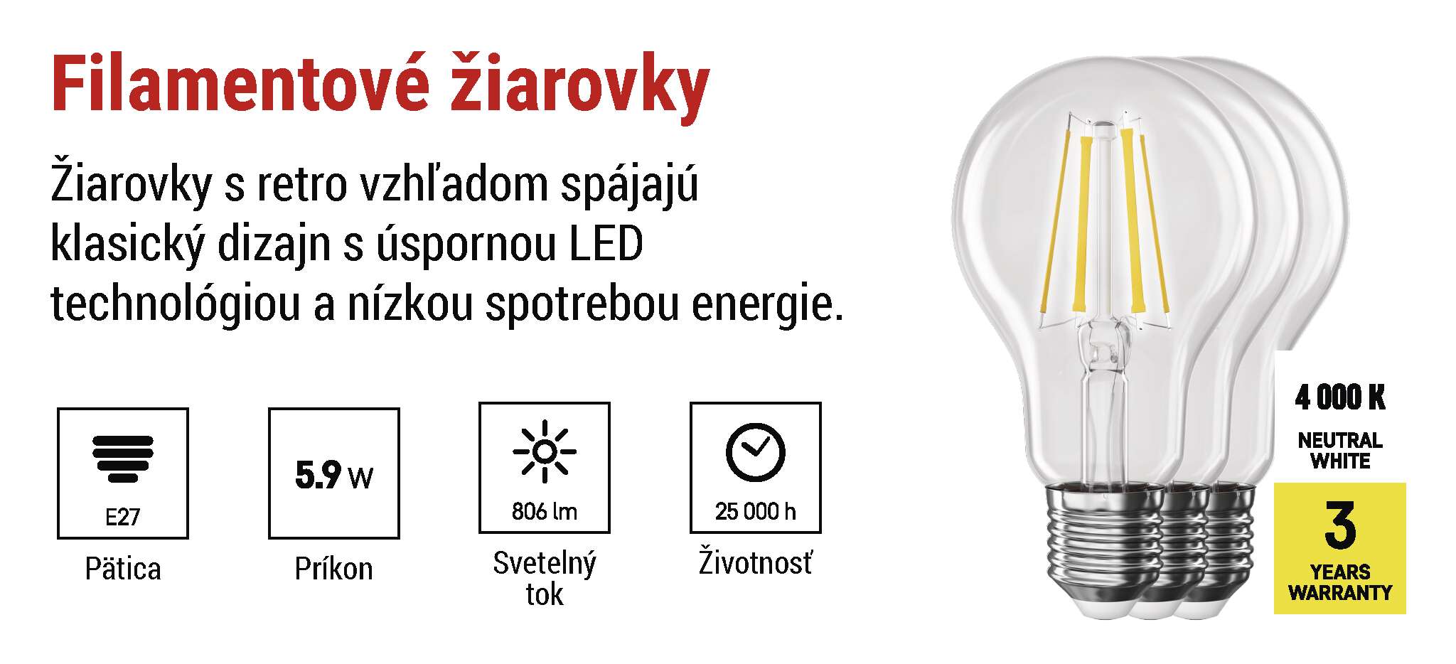 Žiarovky LED FILAMENT poskytujú vysokú svetelnú účinnosť, dlhú životnosť a nízku spotrebu energie. Vďaka klasickému tvaru a štandardnej objímke ich jednoduchá inštalácia a priamočiare osvetlenie pri plnom výkone zaručujú komfort pri každodennom používaní. Sú vyrobené s dôrazom na kvalitu a spoľahlivosť, aby ste s nimi boli dlho spokojní. Preto vám ponúkame 3-ročnú záruku - pretože dobré svetlo si zaslúži byť bezpečné.