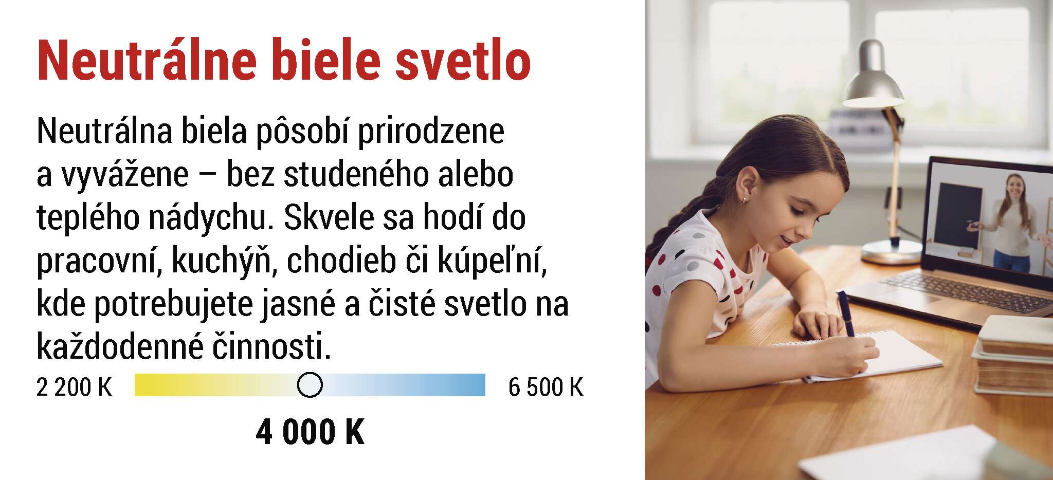 Neutrálne biele svetlo pôsobí čisto, sviežo a prirodzene. Pravdivo zobrazuje farby a nijako ich neskresľuje, čo oceníte pri bežnej každodennej prevádzke. Nie je ani príliš teplé, ani príliš studené - jednoducho vyvážené svetlo, ktoré sa dobre kombinuje s každým interiérom a dennou dobou.