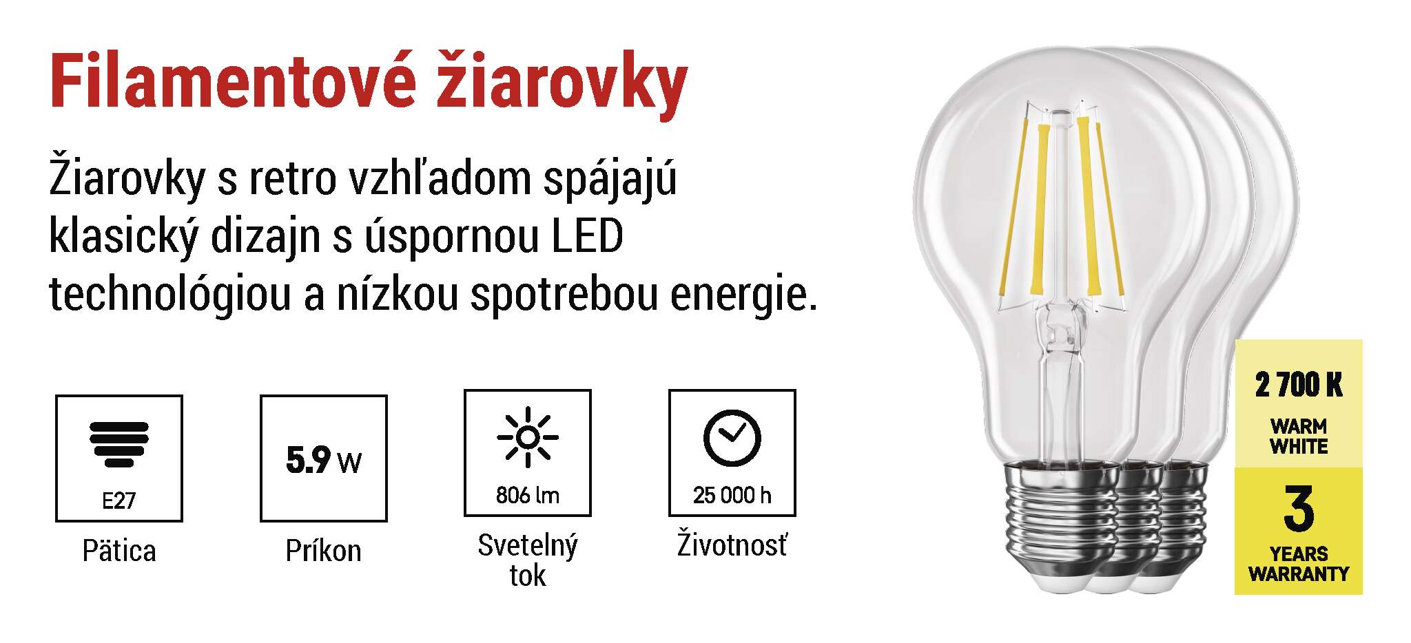 Žiarovky LED FILAMENT poskytujú vysokú svetelnú účinnosť, dlhú životnosť a nízku spotrebu energie. Ich klasický tvar a štandardná objímka umožňujú jednoduchú inštaláciu a neustále svietenie na plný výkon zaručuje komfort pri každodennom používaní.