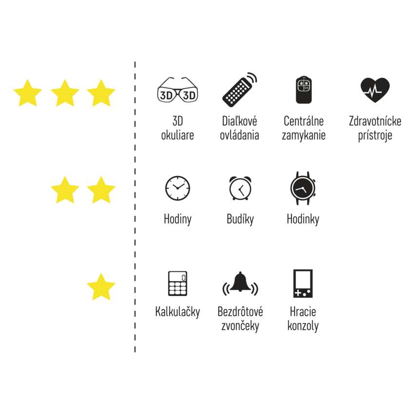 Sú malé, ale praktické. Sú nevyhnutnou súčasťou všetkých moderných domácností, ktoré sa nevyhýbajú novým technológiám. Zaisťujú bezpečnosť vašej rodiny v bezpečnostných systémoch, senzoroch alebo detektoroch dymu, ale uľahčujú aj každodenný život v diaľkovom ovládaní (pre vaše auto, garážové dvere alebo elektrické rolety) a elektrických zámkoch dverí. Jedna sada batérií bude napájať vašu elektroniku mnoho rokov.