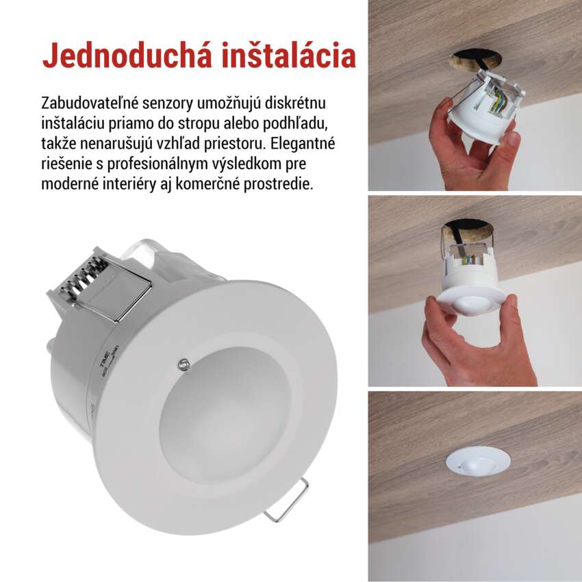 Senzor pohybu je navrhnutý tak, aby bola jeho inštalácia rýchla a jednoduchá. Zapustené vyhotovenie umožňuje elegantné zapustenie do stropu alebo steny, vďaka čomu senzor nenarušuje vzhľad interiéru. Vďaka intuitívnemu zapojeniu a možnosti priameho pripojenia k štandardnej elektrickej sieti môžete senzor začať používať ihneď.