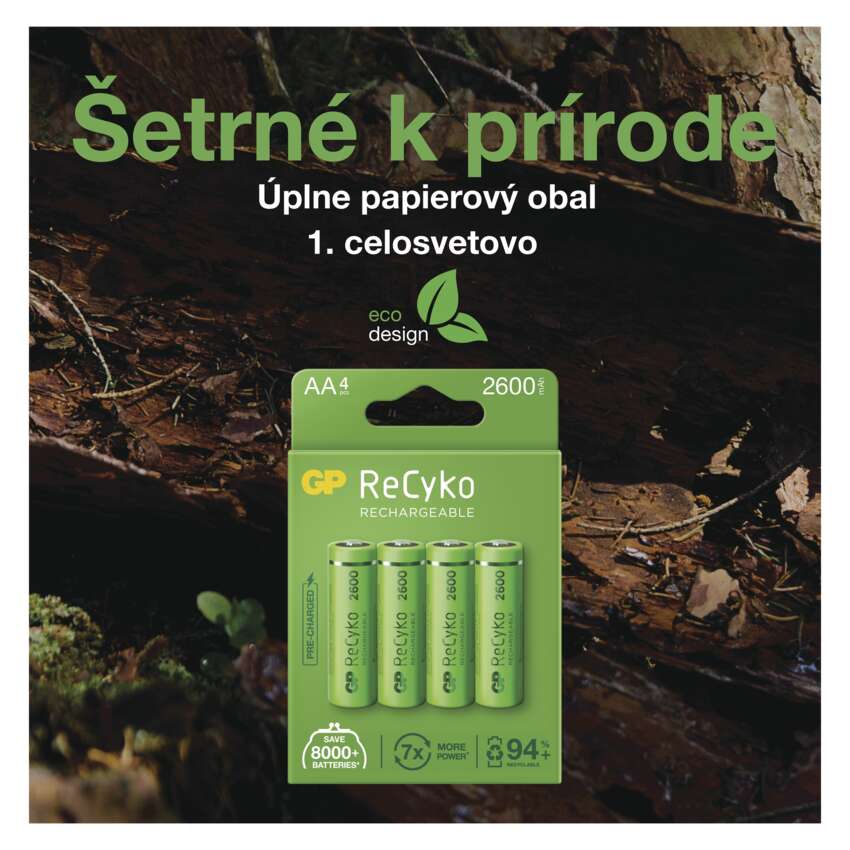 Okrem toho, že sú batérie ReCyko plne spoľahlivé, vás poteší aj ich minimálna ekologická záťaž. Batérie GP ReCyko sú totiž vyrobené tak, aby boli šetrné k životnému prostrediu. Pri výrobe sú využívané už recyklované zdroje. Recyklovateľná je aj väčšina materiálov, z ktorých sú batérie vyrobené. Spoločnosť GP naviac myslela aj na ekologické papierové balenia. Batérie GP sú tak skvelým výrobkom pre tých, ktorým na prírode záleží.