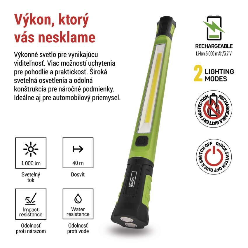 Nabíjacie prac. svietidlo COB LED P4545, 1000 lm, 2600 mAh