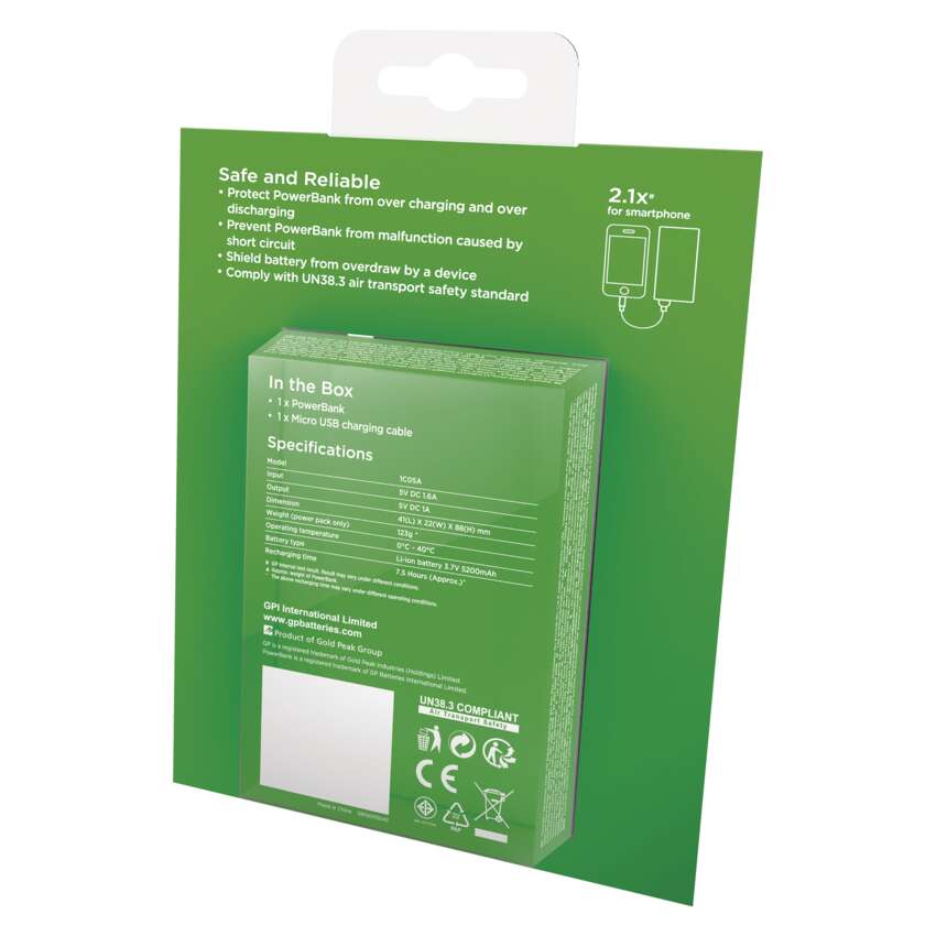 Spoločnosť GP garantuje, že kapacita batérie powerbanku uvádzaná na výrobku je reálna a zodpovedá laboratórne meraným hodnotám pri záťaži 1 A. Pri výbere powerbanku je dôležité vedieť, že pri prenose energie z akýchkoľvek powerbankov dochádza k stratám, preto nemožno priamo prepočítavať kapacitu batérie zariadenia a powerbanku. Produkt môžete bez problémov použiť ihneď po jeho zakúpení a vybalení. Batéria je prednabitá z výroby, a ak neležala dlho v sklade, bude mať stále dostatok energie pre nabitie Vášho zariadenia. Nadmerné teplo je veľkým nepriateľom každej batérie. S powerbankom GP máte istotu, že nedochádza k nadmernému zahrievaniu produktu a je zaistená jeho maximálna životnosť a bezpečnosť.Výhody produktu