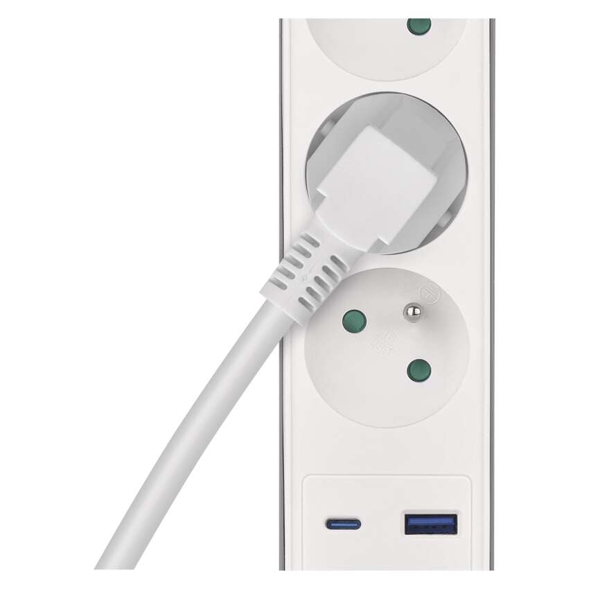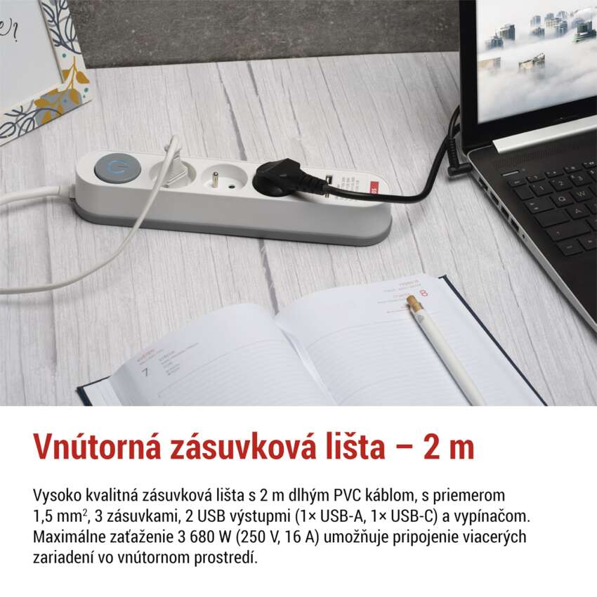 Predlžovací kábel 2 m / 3 zásuvky / s vypínačom / biely / 1×USB-A + 1×USB-C / 1,5 mm2