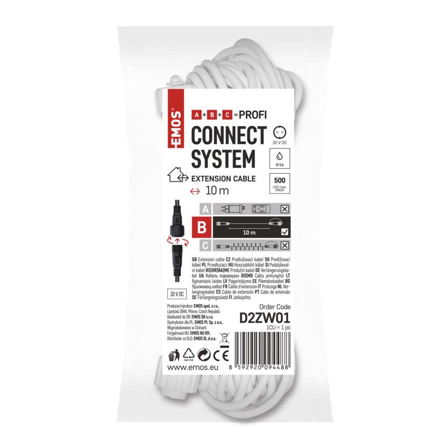 Pripojovací systém CONNECT SYSTEM PROFI je vďaka stupňu krytia IP44 vhodný na použitie v interiéri aj exteriéri. Vyznačuje sa zvýšenou odolnosťou materiálu a predĺženou zárukou 3 roky. Vysokokvalitné gumové káble umožňujú celoročnú inštaláciu bez potreby demontáže v akýchkoľvek teplotných podmienkach. Vyberte si zo štandardných reťazí, krokových reťazcov a klastrov. Z jedného napájacieho zdroja(A) pripojeného k predlžovacím káblom, rozbočovačom(B) a svetelné prvky LED(C) môžu napájať až 500 svetiel LED.