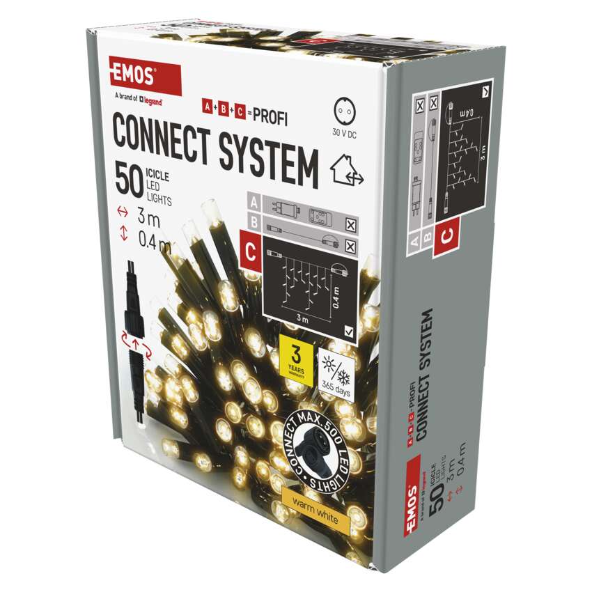 LED icicles CONNECT SYSTEM PROFI sú k dispozícii v dĺžke 3 m a výške 0,4 m. Ak hľadáte farbu, ktorá najlepšie ladí s exteriérom alebo interiérom vášho domu, môžete si vybrať teplú bielu, studenú bielu alebo kombináciu farieb s viacerými LED svetlami na jednej reťazi.