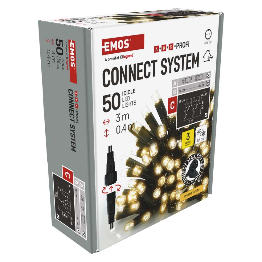 Pripojovací systém CONNECT SYSTEM PROFI je vďaka stupňu krytia IP44 vhodný na použitie v interiéri aj exteriéri. Vyznačuje sa zvýšenou odolnosťou materiálu a predĺženou zárukou 3 roky. Vysokokvalitné gumové káble umožňujú celoročnú inštaláciu bez potreby demontáže v akýchkoľvek teplotných podmienkach. Vyberte si zo štandardných reťazí, stalaktitov a klastrov. Z jedného napájacieho zdroja(A) pripojeného k predlžovacím káblom, rozbočovačom(B) a svetelné prvky LED(C) môžu napájať až 500 svetiel LED.