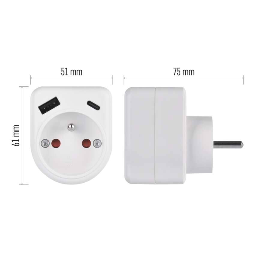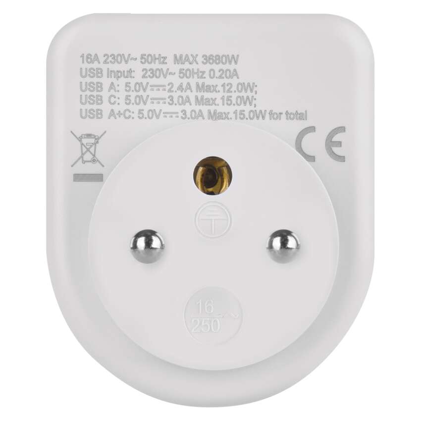 | produkt | rozbočovacia zásuvka 1× + 1× USB-A 5 V DC/2,4 A/ 12 W + 1× USB-C 5 V DC/ 3 A/ 15 W, Total A+C: 3 A/ 15 W max. |