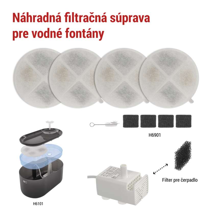 Súprava náhradných filtrov obsahuje 4 ks vysokokvalitných bavlnených filtrov s iónovým výmenníkom, kokosovým vláknom a aktívnym uhlím, 4 ks filtrov pre čerpadlo a čistiacu kefku. Táto náhradná súprava filtrov je vhodná pre vodnú fontánu EMOS PET-201 (H6101) a vodnú fontánu GoSmart PET-202 (H6102).