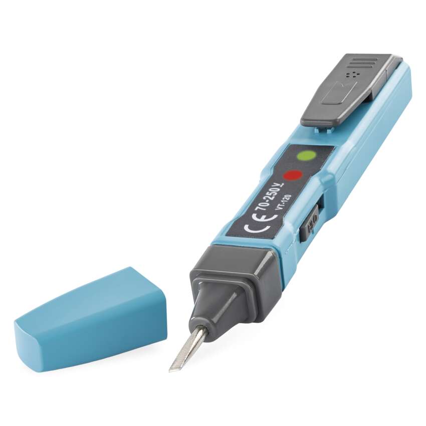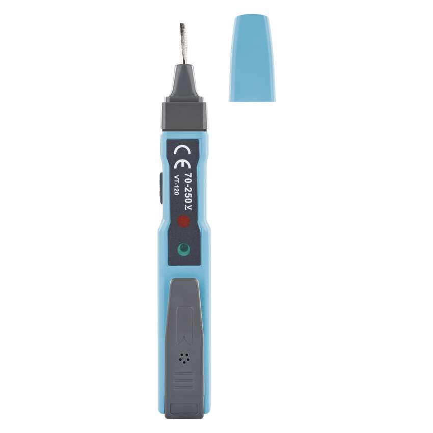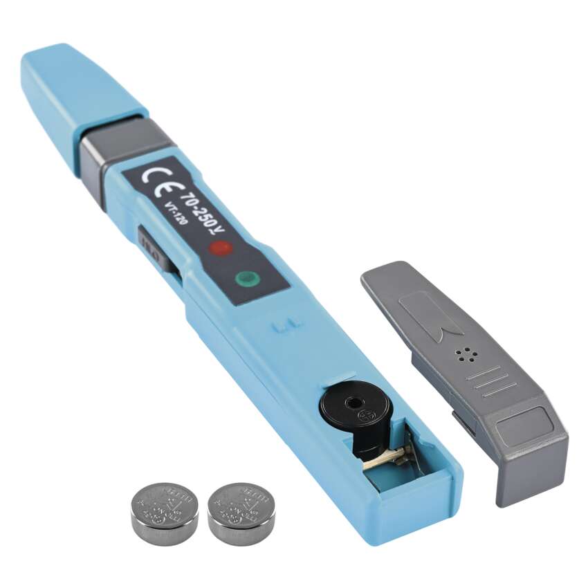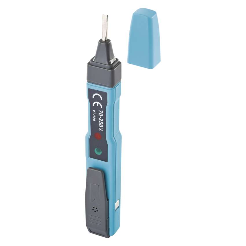 Skúšačka napätia s optickou signalizáciou. Skúšačka je určená na zisťovanie striedavého napätia 70–250 V a jednosmerného napätia 0–250 V. Skúšačka zisťuje tiež polaritu zdrojov alebo skrat. Skúšačka napätia je napájaná 2× LR41 (súčasť balenia).