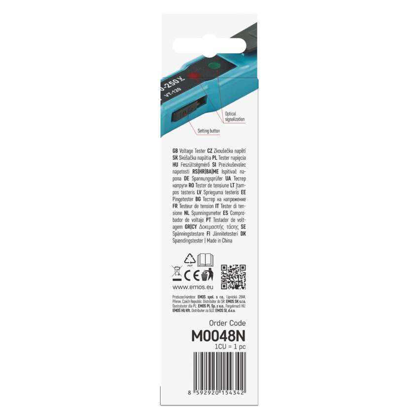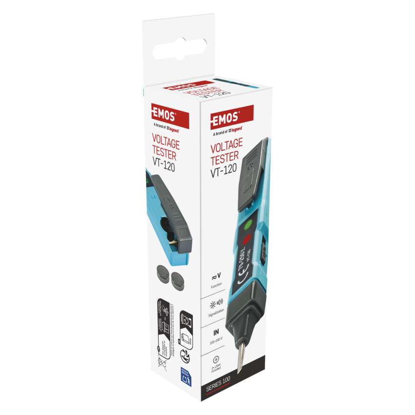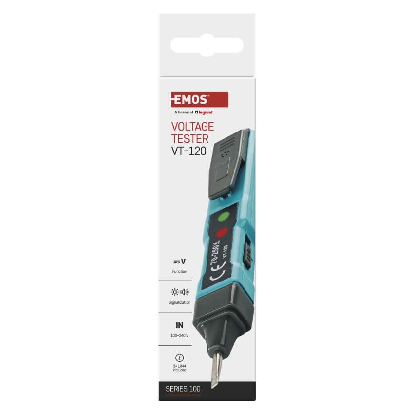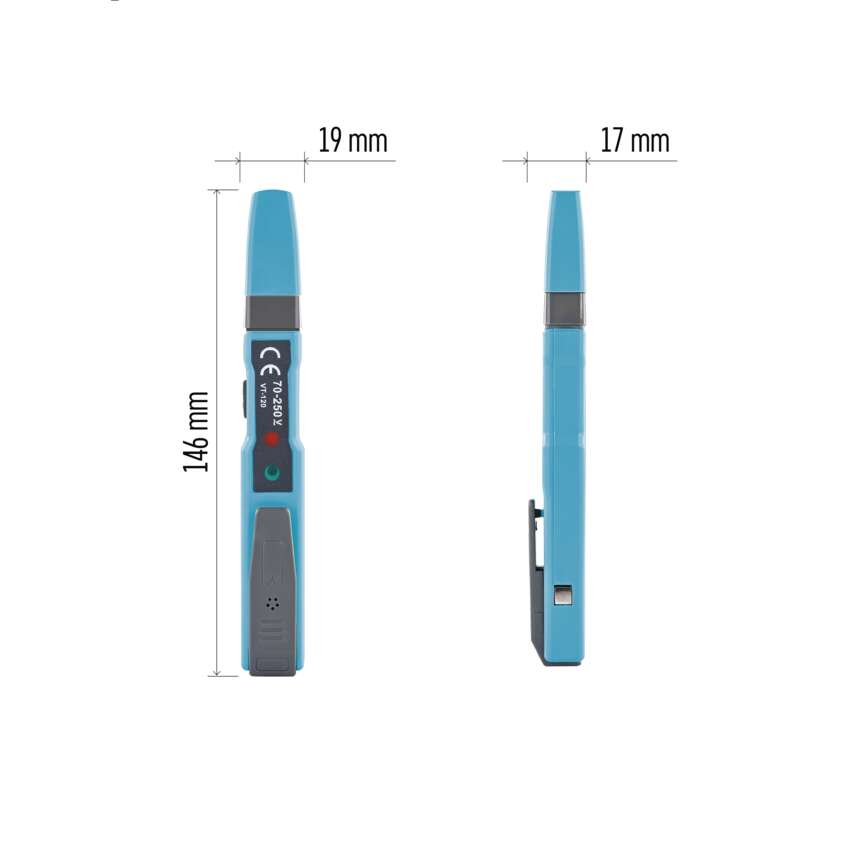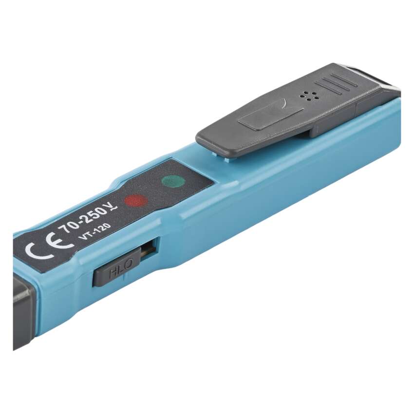Skúšačka napätia s optickou signalizáciou. Skúšačka je určená na zisťovanie striedavého napätia 70–250 V a jednosmerného napätia 0–250 V. Skúšačka zisťuje tiež polaritu zdrojov alebo skrat. Skúšačka napätia je napájaná 2× LR41 (súčasť balenia).