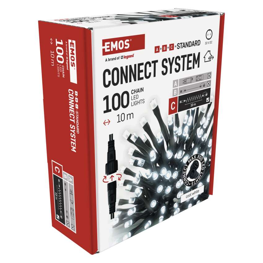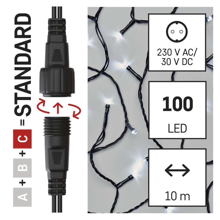 Pripojovací systém CONNECT SYSTEM STANDARD je vďaka stupňu krytia IP44 vhodný na vnútorné aj vonkajšie použitie, ale len počas sezóny, nie celoročne. Výhodou tohto systému pripojenia je široká ponuka svetelných prvkov LED(C) v niekoľkých rôznych farbách. Hoci najobľúbenejším vianočným osvetlením je reťaz, v spojovacom systéme si môžete vybrať z krápnikov, záclon, sietí alebo hviezd na vrchol vianočného stromčeka podľa vlastných dizajnových preferencií. Z jedného napájacieho zdroja (A) pripojeného k predlžovacím káblom, rozbočovačom (B) a svetelné prvky LED(C) môžu napájať až 800 svetiel LED.