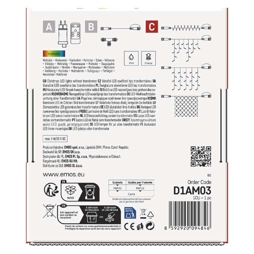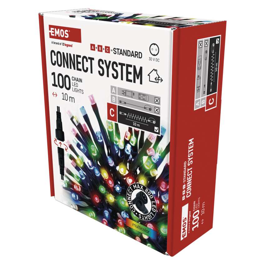 Pripojovací systém CONNECT SYSTEM STANDARD je vďaka stupňu krytia IP44 vhodný na vnútorné aj vonkajšie použitie, ale len počas sezóny, nie celoročne. Výhodou tohto systému pripojenia je široká ponuka svetelných prvkov LED(C) v niekoľkých rôznych farbách. Hoci najobľúbenejším vianočným osvetlením je reťaz, v spojovacom systéme si môžete vybrať z krápnikov, záclon, sietí alebo hviezd na vrchol vianočného stromčeka podľa vlastných dizajnových preferencií. Z jedného napájacieho zdroja (A) pripojeného k predlžovacím káblom, rozbočovačom (B) a svetelné prvky LED(C) môžu napájať až 800 svetiel LED.