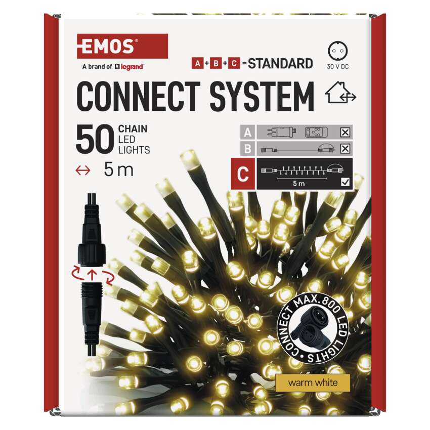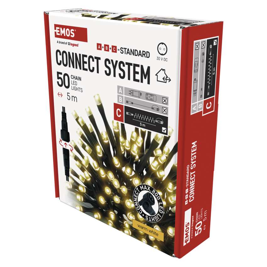 Pripojovací systém CONNECT SYSTEM STANDARD je vďaka stupňu krytia IP44 vhodný na vnútorné aj vonkajšie použitie, ale len počas sezóny, nie celoročne. Výhodou tohto systému pripojenia je široká ponuka svetelných prvkov LED(C) v niekoľkých rôznych farbách. Hoci najobľúbenejším vianočným osvetlením je reťaz, v spojovacom systéme si môžete vybrať z krápnikov, záclon, sietí alebo hviezd na vrchol vianočného stromčeka podľa vlastných dizajnových preferencií. Z jedného napájacieho zdroja (A) pripojeného k predlžovacím káblom, rozbočovačom (B) a svetelné prvky LED(C) môžu napájať až 800 svetiel LED.