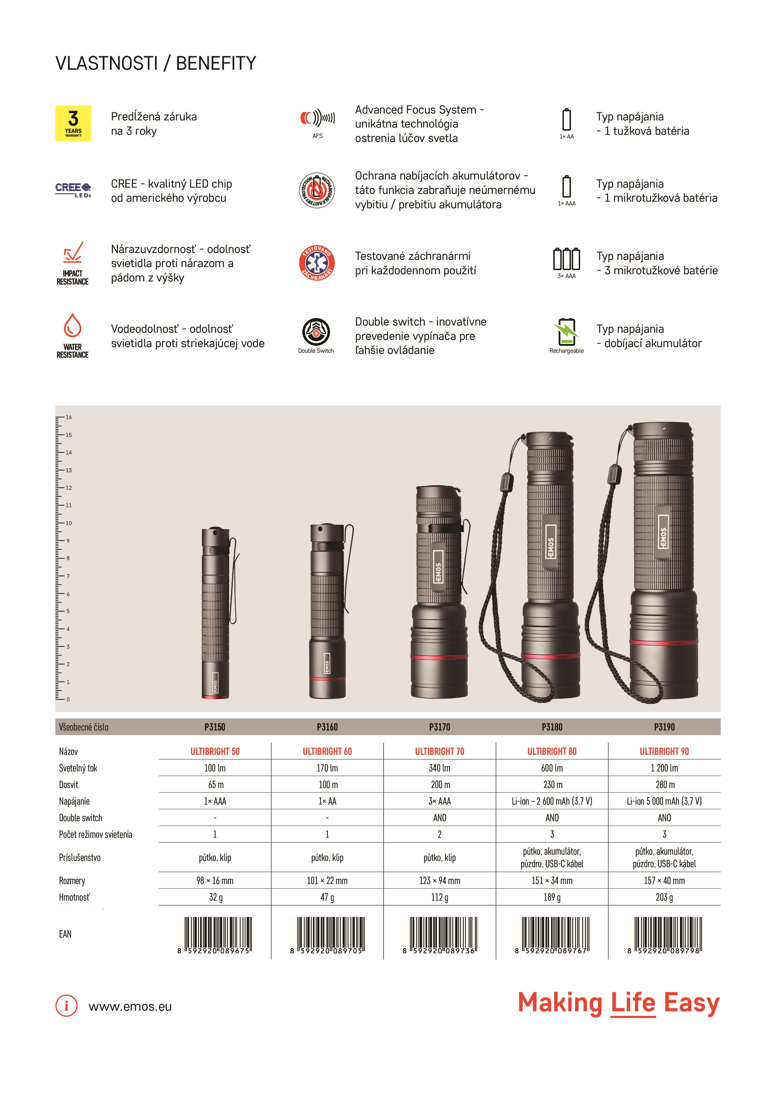 Skvele vám poslúži ako spoľahlivý pomocník v práci, pri ktorej sa potrebujete na funkčnosť svojho náradia plne spoľahnúť. Rovnako tak ale baterku EMOS Ultibright oceníte pri bežnom používaní doma, v prírode, alebo na cestách. vďaka praktickému klipu, spoľahlivému pútku a kompaktným rozmerom budete mať svietidlo pri sebe vo všetkých situáciách, kedy to bude potrebné. Na svietidlá EMOS Ultibright štandardne poskytujeme trojročnú záruku.