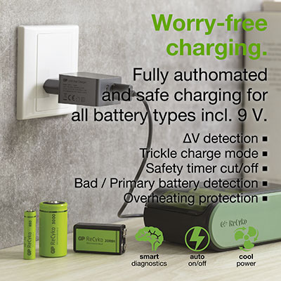 Nechcete kupovať stále nové a nové batérie? A radi by ste ušetrili čas aj peniaze? riešením je univerzálna nabíjačka B631, ktorá je novinkou značky GP Batteries. Nabíjačka sľubuje rýchlejšie a presnejšie nabíjanie ako jej predchodcovia a nabíja až 6 batérií naraz. Navyše si poradí hneď s niekoľkými druhmi batérií (AA, AAA, C, D,, 9V). Vďaka rade praktických funkcií sa môžete spoľahnúť na úplne bezstarostné nabíjanie, čo platí aj pre 9V batéria. V neposlednom rade si vás určite získa jej moderný vzhľad, nízka váha aj kompaktné rozmery a plastový kryt, ktorý chráni nabíjačku pred nečistotami. Nabíjačku môžete ľahko nabiť kdekoľvek a kedykoľvek vďaka micro USB káblu, ktorý je súčasťou balenia.