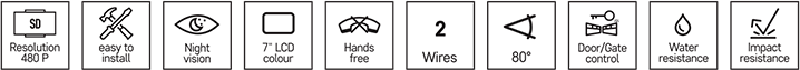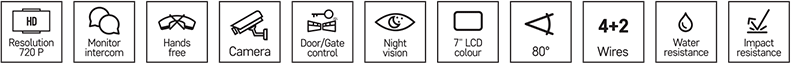Okrem toho, že videotelefón so širokým uhlom záberu zvládne perfektne zobraziť prichádzajúceho za šera či v noci, pripojíte na 7” farebnú obrazovku s vysokým rozlíšením až 2 samostatné bezpečnostné kamery. Pomocou videotelefónov naviac stlačením jediného tlačidla otvoríte dverový zámok alebo môžete ovládať pojazd brány.