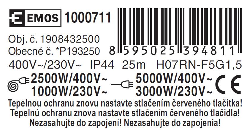 | max. zaťaženie navinutého | 230 V~: 4,35 A max./1 000 W; 400 V~: 6,25 A max./2 500 W |