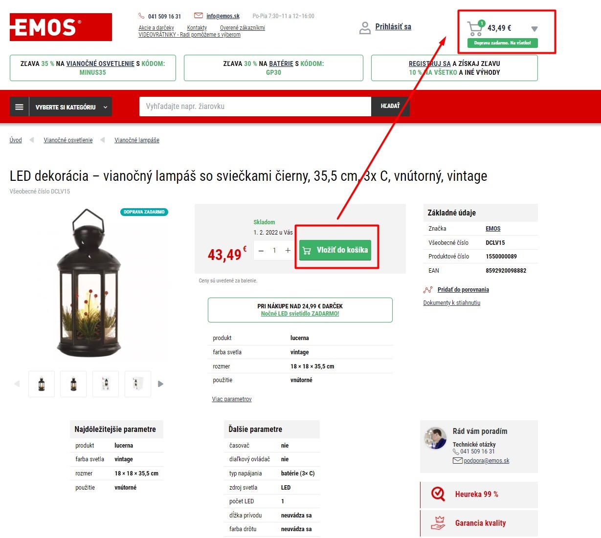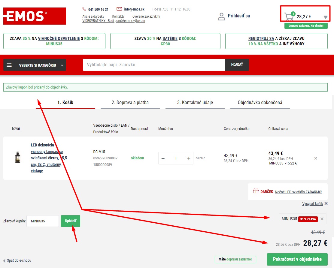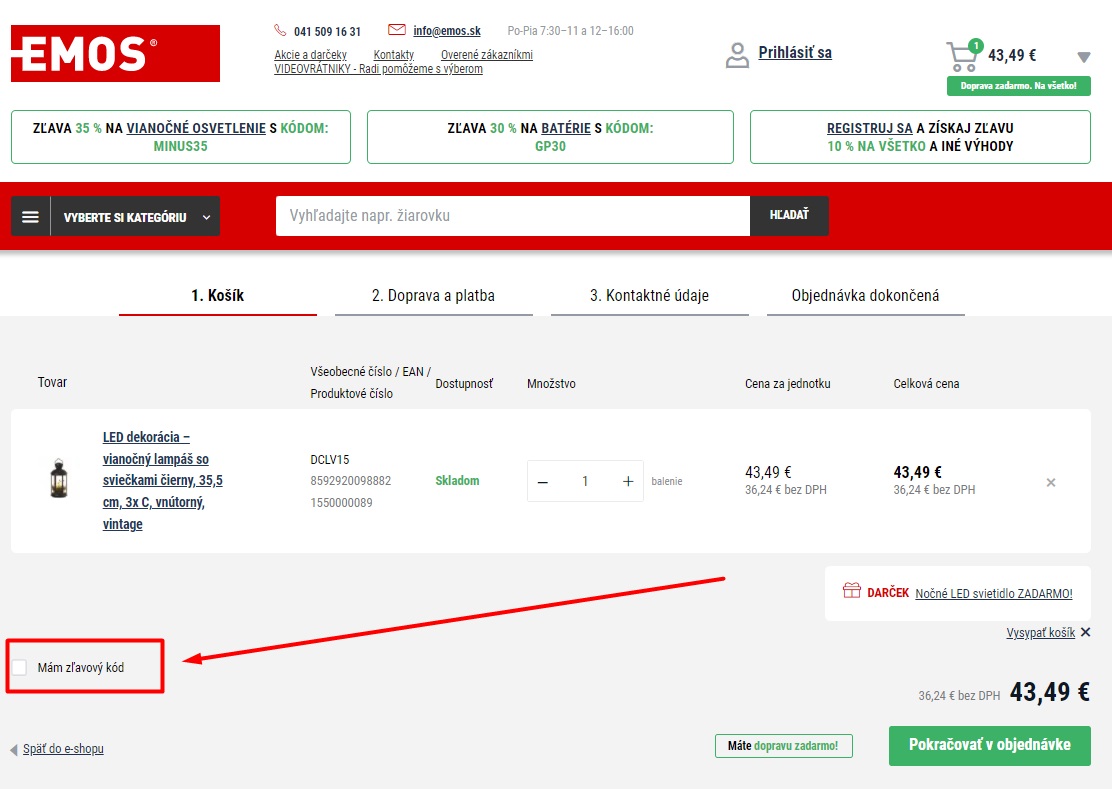 1. Vložte do košíka tovar, na ktorý je možné uplatniť zľavový kód. Aktuálne platné zľavové kódy nájdete na stránke Akcie a darčeky EMOS | EMOS.sk.