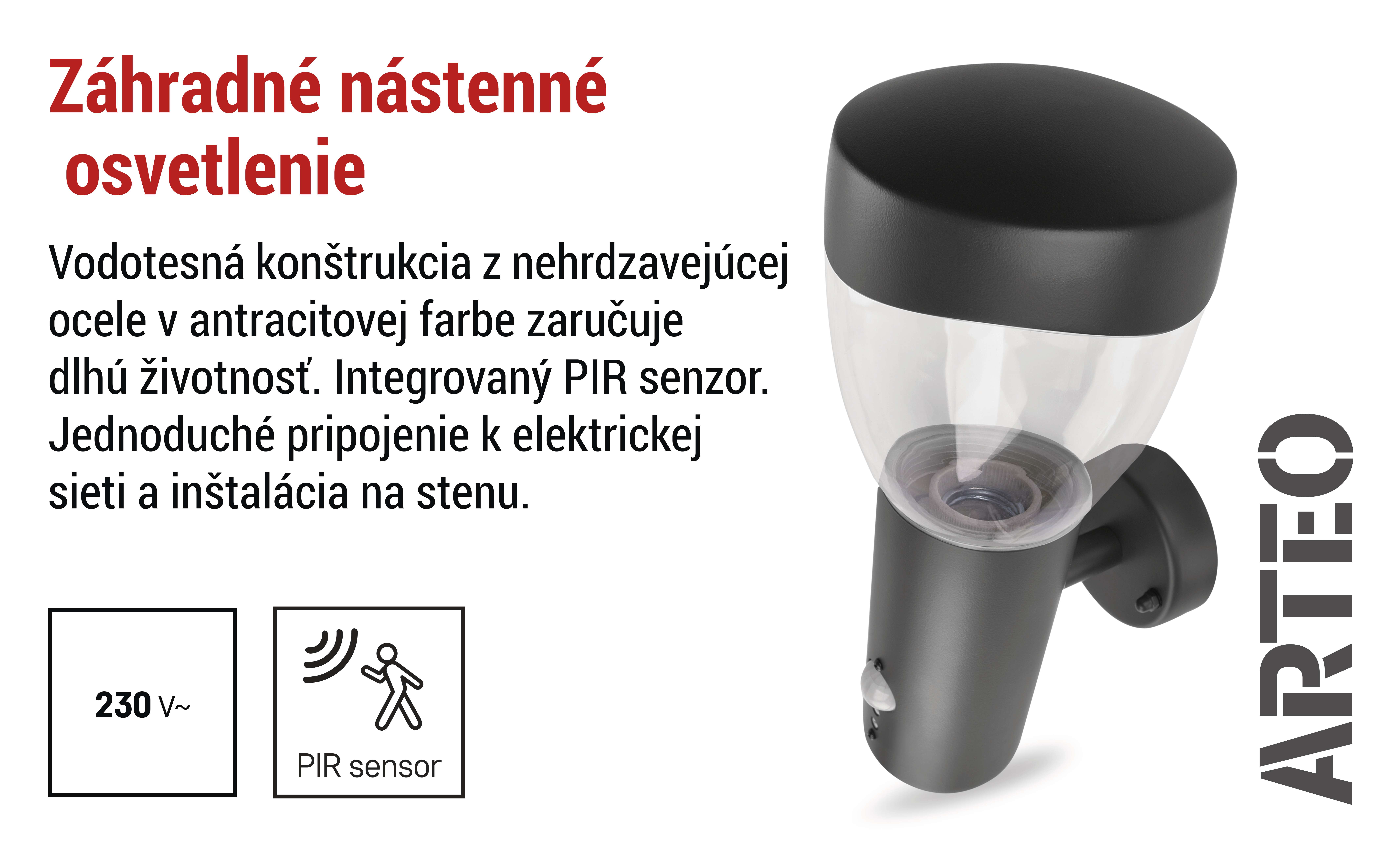Záhradné nástenné svietidlo ARTEO, senzor súmraku, 16,4 x 12 x 29,5 cm, 1 x E27, 15 W
