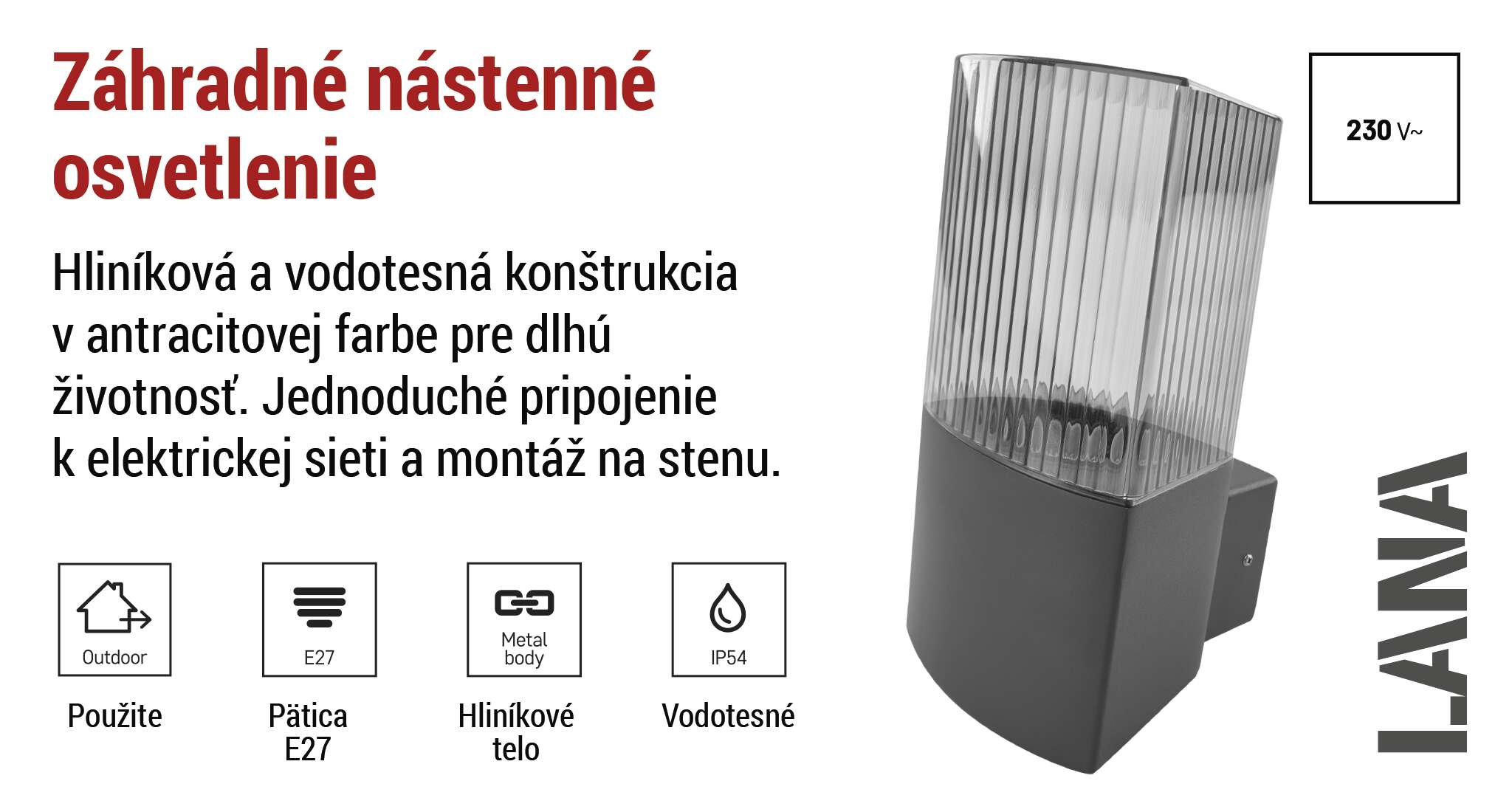 Záhradné svietidlá série LANA v sebe spájajú elegantný dizajn s vysokokvalitným osvetlením, a sú tak dokonalým doplnkom každého vonkajšieho priestoru. Vďaka precíznemu spracovaniu a odolným materiálom poskytujú spoľahlivý výkon v akýchkoľvek podmienkach. Rad LANA ponúka rôzne modely záhradných svietidiel vrátane nástenných a stĺpových variantov, takže si môžete vybrať riešenie, ktoré vyhovuje vašim potrebám a štýlu vašej záhrady.