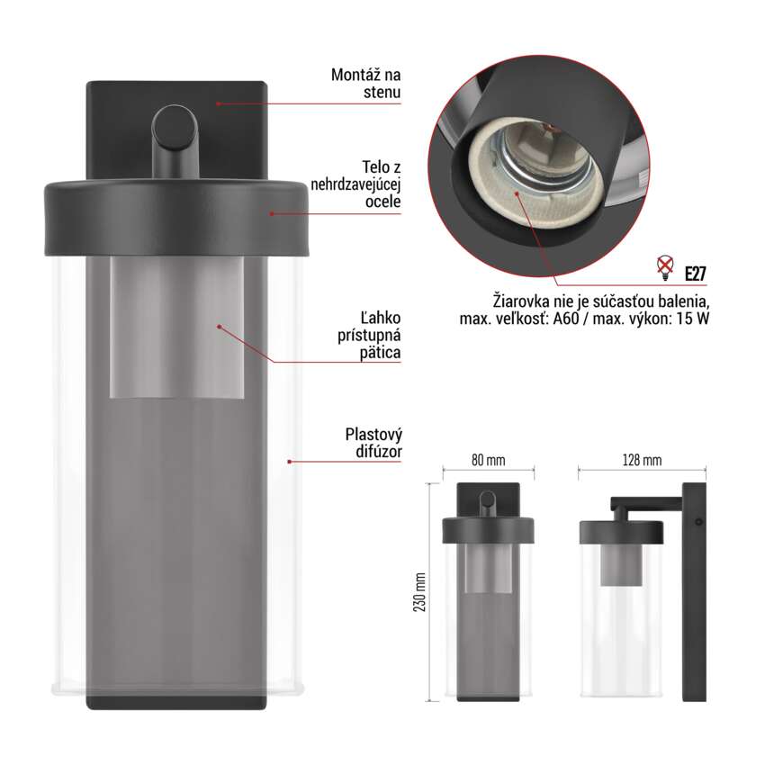 Záhradné nástenné svietidlo ZALA, 14,5 x 8,9 x 26,2 cm, 1 x E27, 15 W
